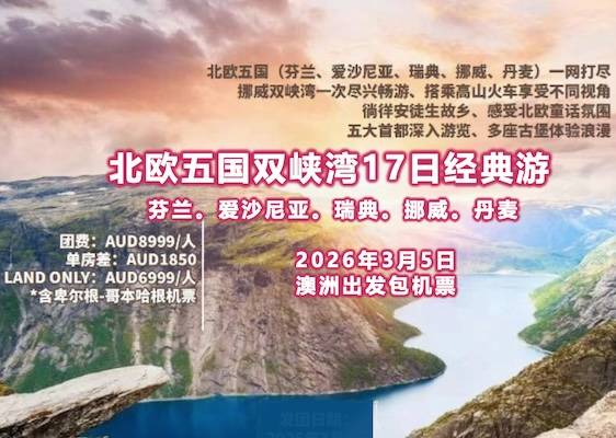【3月5日澳洲出发包机票】ZGM 欧洲 北欧五国双峡湾17日经典游-芬兰|爱沙尼亚|瑞典|挪威|丹麦